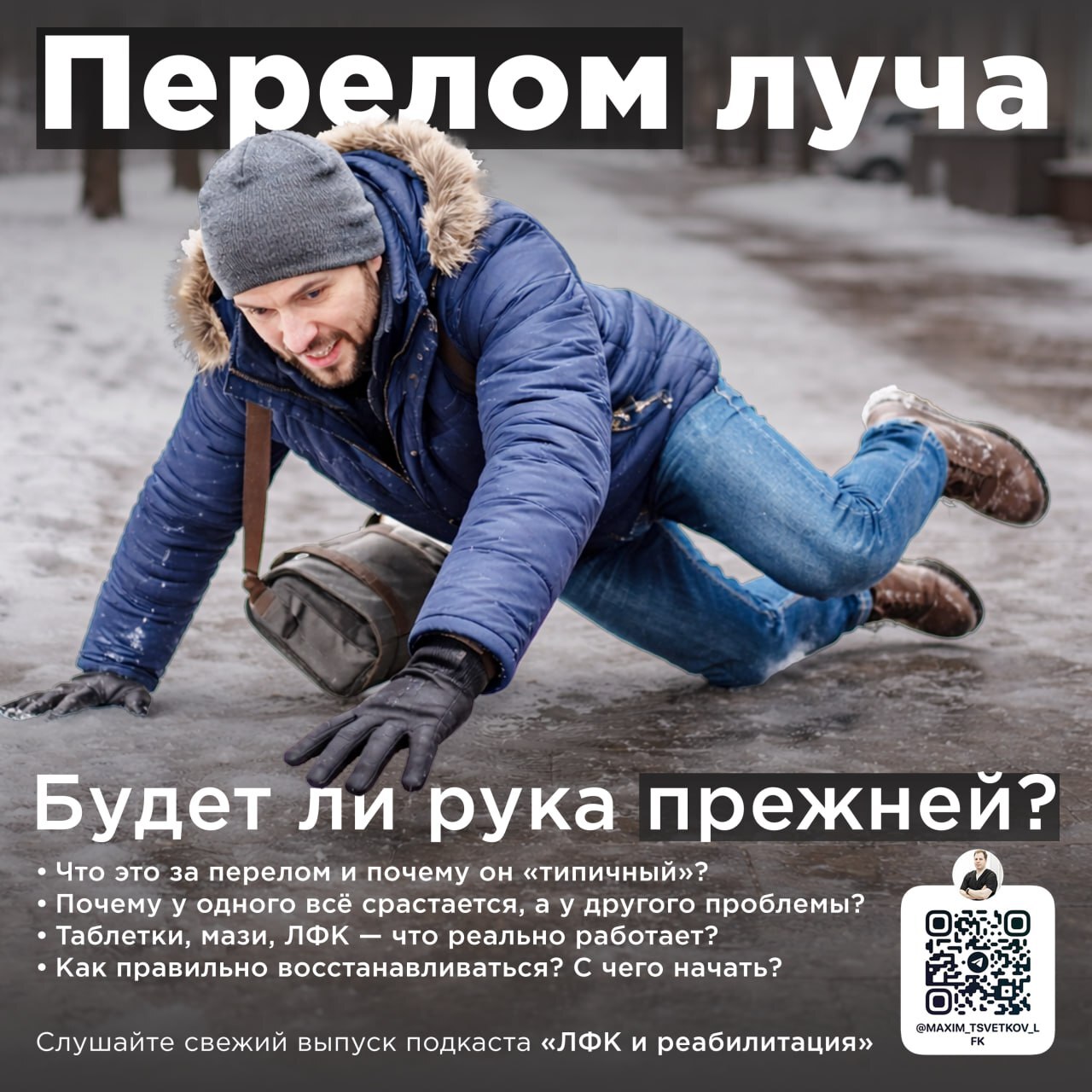 Праздники закончились. Обычное утро, дорога на работу — и внезапное падение: поскользнулись или неудачно споткнулись. Инстинктивно выставили руку. Удар не кажется сильным, ничего критичного не произошло. Но через несколько часов кисть начинает отекать, появляется боль при опоре на руку. Приходится ехать в травмпункт — и там звучит диагноз: «перелом».